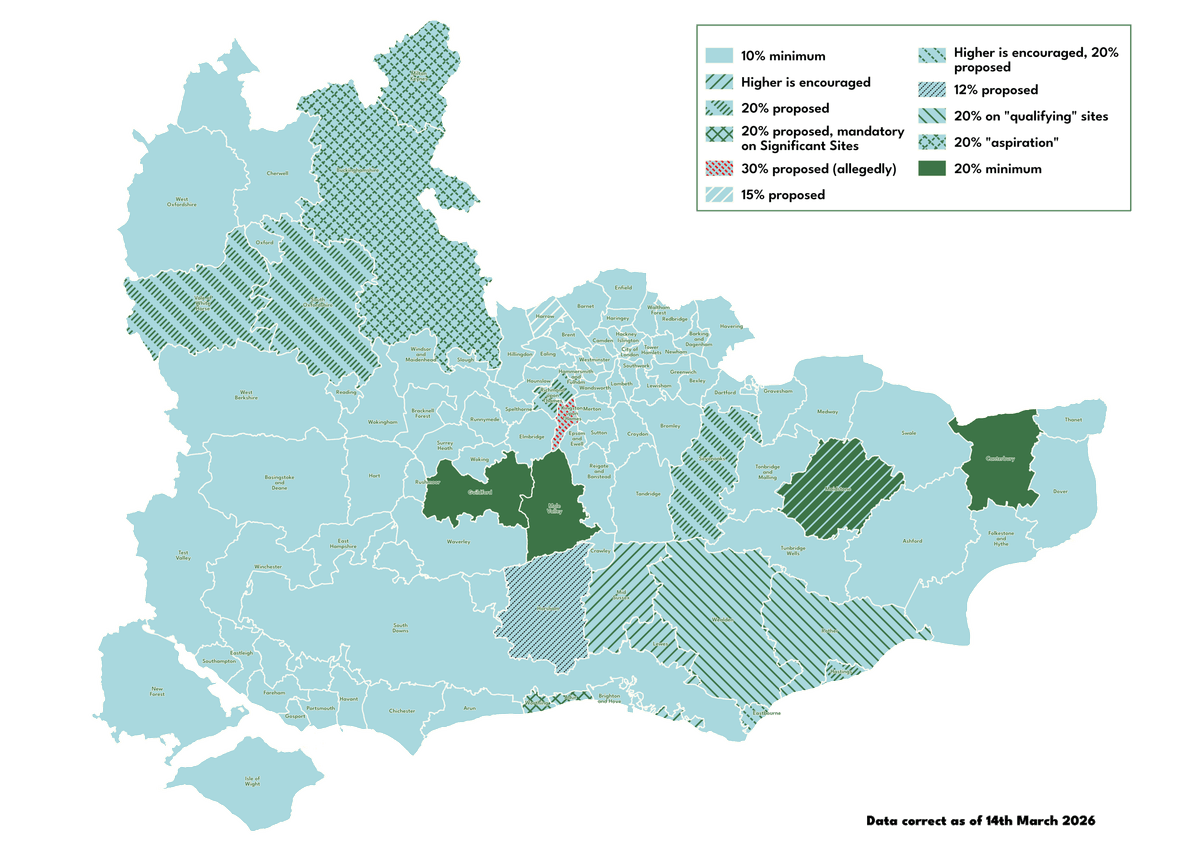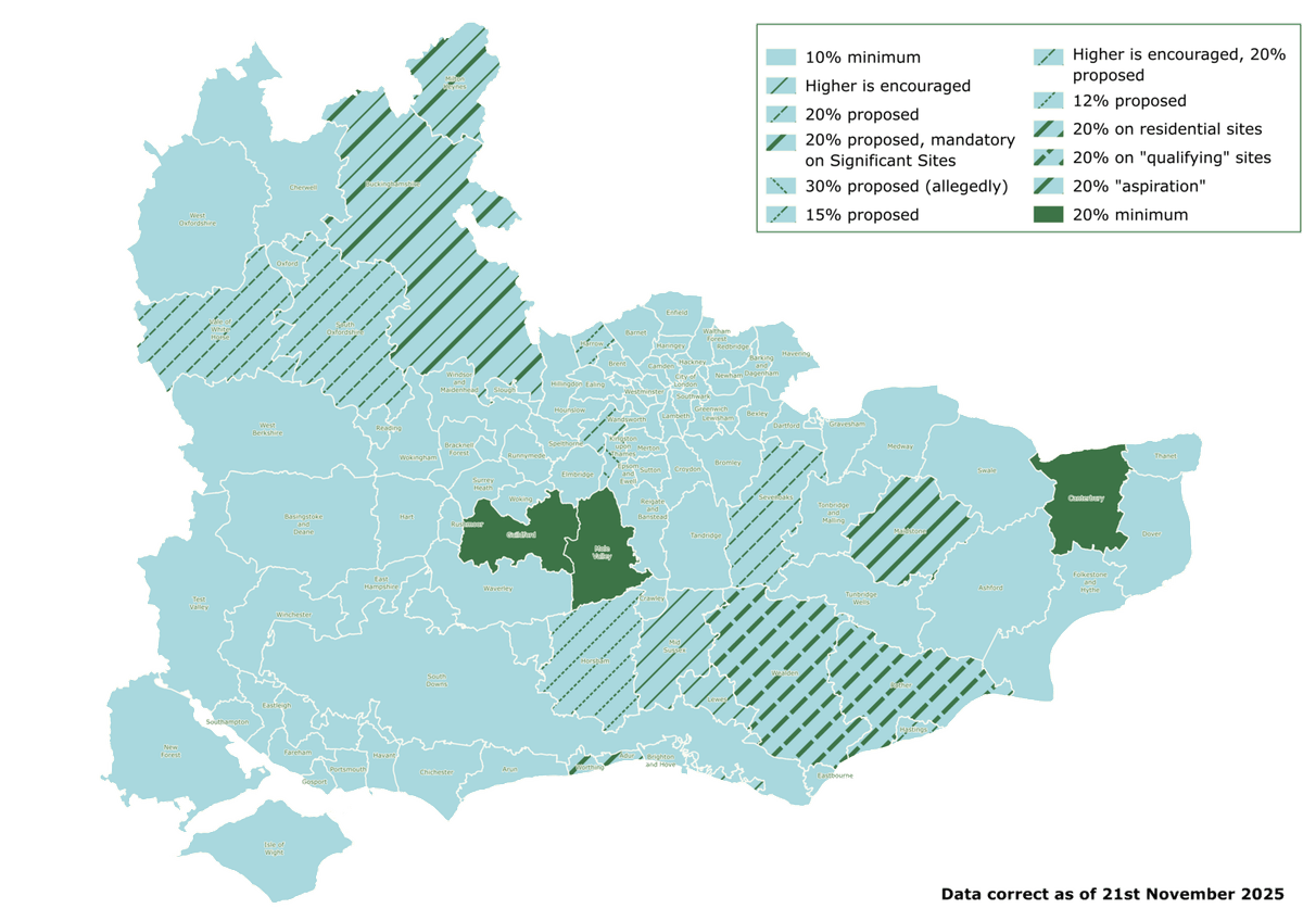 Wealden 10% BNG (20% BNG on “qualifying” sites); Rother 10% BNG (20% BNG on “qualifying” sites); Hastings 10% BNG (20% BNG proposed); Eastbourne 10% BNG (higher is encouraged, 20% BNG proposed); Lewes 10% BNG (higher is encouraged); Brighton & Hove 10% BNG; South Downs 10% BNG; Thanet 10% BNG; Dover 10% BNG; Canterbury 20% BNG; Folkestone & Hythe 10% BNG; Tunbridge Wells 10% BNG; Ashford 10% BNG; Maidstone 10% BNG (20% BNG on residential sites); Swale 10% BNG; Tonbridge and Malling 10% BNG; Medway 10% BNG; Gravesham 10% BNG; Dartford 10% BNG; Sevenoaks 10% BNG (20% BNG proposed); Ebbsfleet Development Corporation 10% BNG; Adur 10% BNG (20% BNG encouraged, mandatory on Significant Sites); Worthing 10% BNG (20% BNG encouraged, mandatory on Significant Sites); Arun 10% BNG; Chichester 10% BNG; Horsham 10% BNG (12% BNG proposed); Mid Sussex 10% BNG (higher is encouraged); Crawley 10% BNG; Tandridge 10% BNG; Reigate and Banstead 10% BNG; Epsom and Ewell 10% BNG; Mole Valley 20% BNG; Elmbridge 10% BNG; Spelthorne 10% BNG; Runnymede 10% BNG; Surrey Heath 10% BNG; Woking 10% BNG; Guildford 20% BNG; Waverley 10% BNG; West Berkshire 10% BNG; Reading 10% BNG; Wokingham 10% BNG; Windsor and Maidenhead 10% BNG; Slough 10% BNG; Bracknell Forest 10% BNG; Basingstoke and Deane 10% BNG; Hart 10% BNG; Rushmoor 10% BNG; East Hampshire 10% BNG; Winchester 10% BNG; Test Valley 10% BNG; Eastleigh 10% BNG; Southampton 10% BNG; Fareham 10% BNG; Gosport 10% BNG; Portsmouth 10% BNG; Havant 10% BNG; New Forest 10% BNG; Isle of Wight 10% BNG; Enfield 10% BNG; Waltham Forest 10% BNG; Redbridge 10% BNG; Havering 10% BNG; Barking and Dagenham 10% BNG; London Legacy Development Corporation 10% BNG; Bexley 10% BNG; Greenwich 10% BNG; Newham 10% BNG; Tower Hamlets 10% BNG; Lewisham 10% BNG; Bromley 10% BNG; Croydon 10% BNG; Sutton 10% BNG; Merton 10% BNG; Wandsworth 10% BNG; Lambeth 10% BNG; Southwark 10% BNG; Kensington and Chelsea 10% BNG; Westminster 10% BNG; Hammersmith and Fulham 10% BNG; Hounslow 10% BNG; Richmond upon Thames 10% BNG (20% BNG proposed); Kingston upon Thames 10% BNG (30% BNG proposed); Hillingdon 10% BNG; Old Oak and Park Royal Development Corporation 10% BNG; Ealing 10% BNG; Brent 10% BNG; Harrow 10% BNG (15% BNG proposed); Camden 10% BNG; Barnet 10% BNG; Haringey 10% BNG; Islington 10% BNG; Hackney 10% BNG; City of London 10% BNG; Cherwell 10% BNG; West Oxfordshire 10% BNG; Oxford 10% BNG; Vale of White Horse 10% BNG (20% BNG proposed); South Oxfordshire 10% BNG (20% BNG proposed); Buckinghamshire 10% BNG (20% BNG “aspiration”); Milton Keynes 10% BNG (20% BNG “aspiration”)